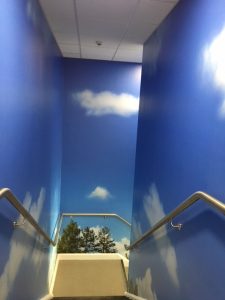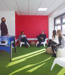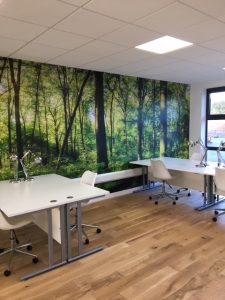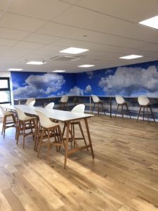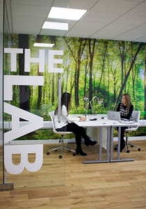The brief was to design a innovative and exciting space for the young business to feel inspired by their surroundings. We have let our imaginations run wild and created a space with an inspiration room complete with fake grass flooring, table football and walls you can write on. With floor to ceiling clouds in 'The Hub' the business using the space can really get into some 'blue sky thinking'. Downstairs in 'The Lab' it feels like you are working in the middle of Rendlesham Forest rather than a business Park. There is also a 'Chill out Zone' where people can go to relax with a coffee and socialise with their fellow entrepreneurs